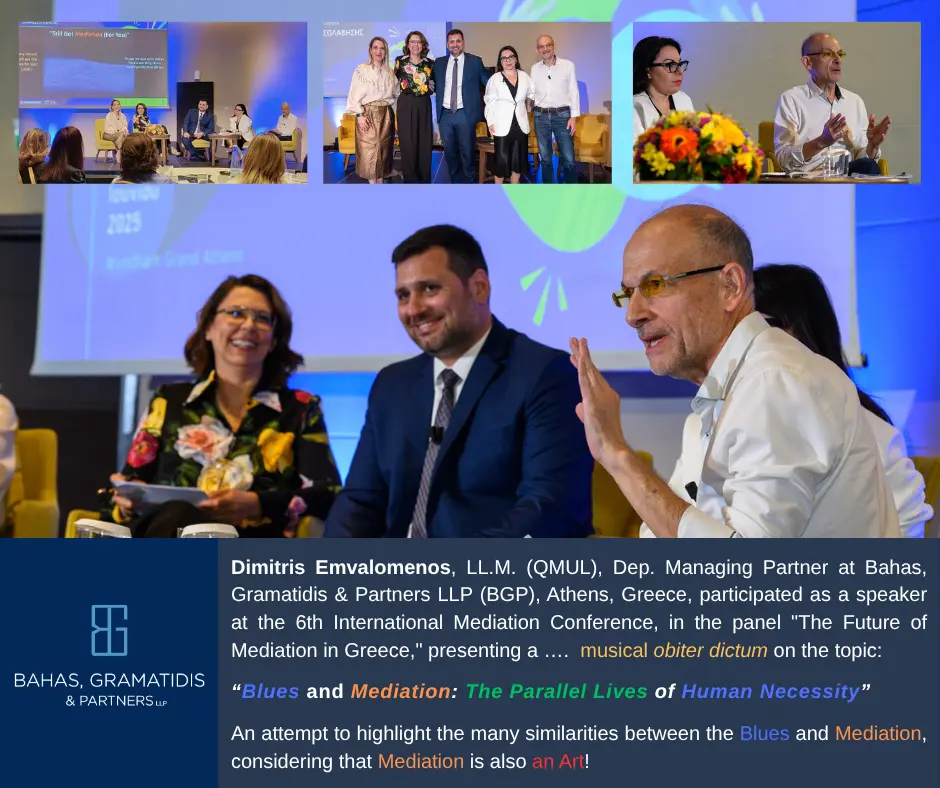 Dimitris Emvalomenos, LL.M. (QMUL), Accredited Mediator of the Greek Ministry of Justice & the Centre of Effective Dispute Resolution (CEDR), London, UK, Dep. Managing Partner at Bahas, Gramatidis & Partners LLP (BGP), Athens, Greece, participated as a speaker at the 6th International Mediation Conference [5.6.2025], on the panel “The Future of Mediation in Greece”, presenting a … musical obiter dictum on the topic: