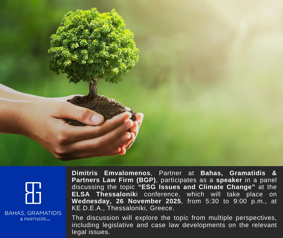 Dimitris Emvalomenos, Partner at Bahas, Gramatidis & Partners Law Firm (BGP), participates as a speaker in a panel discussing the topic “ESG Issues and Climate Change” at the ELSA Thessaloniki conference, which will take place on Wednesday, 26 November 2025, from 5:30 to 9:00 p.m., at KE.D.E.A., Thessaloniki, Greece.