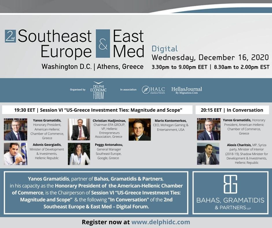 We are proud to announce that Yanos Gramatidis, Partner of Bahas, Gramatidis & Partners, in his capacity as the Honorary President of the American-Hellenic Chamber of Commerce, is the chairperson of Session VI “US-Greece Investment Ties: Magnitude and Scope” & the following “In Conversation” of the 2nd Southeast Europe & East Med – Digital, organized by the Delphi Economic Forum in association with the Hellenic Association Leadership Council (HALC) & Hellas Journal.